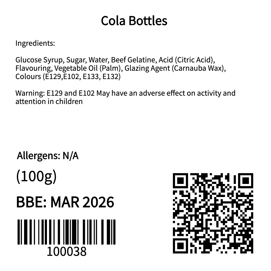 Glucose Syrup, Sugar, Water, Beef Gelatine, Acid (Citric Acid), Flavouring, Vegetable Oil (Palm), Glazing Agent (Carnauba Wax), Colours (E129,E102, E133, E132)