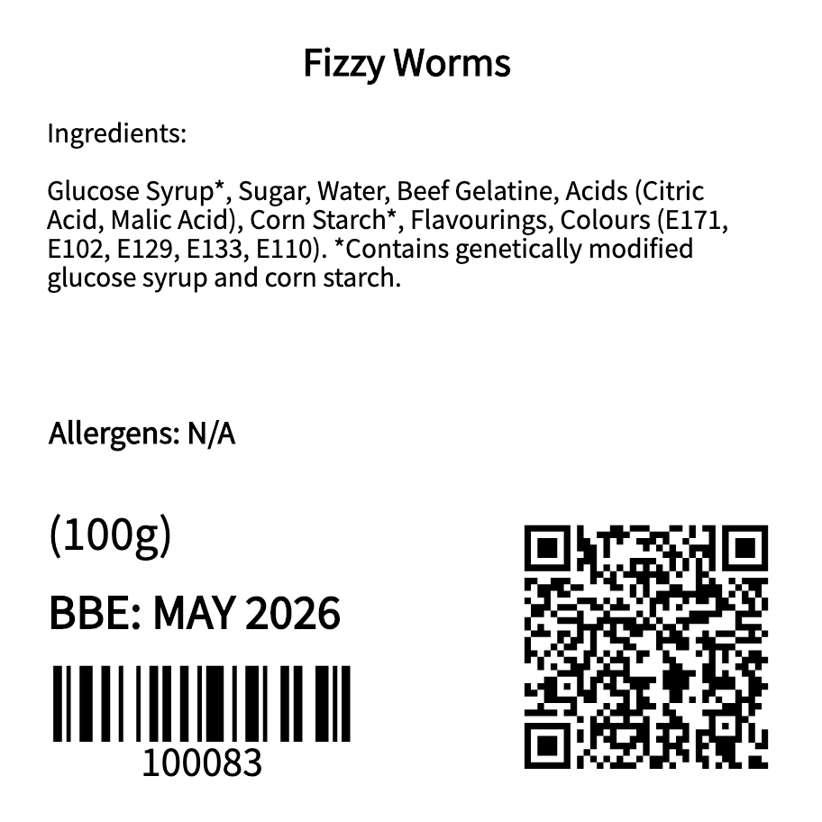 Glucose Syrup*, Sugar, Water, Beef Gelatine, Acids (Citric Acid, Malic Acid), Corn Starch*, Flavourings, Colours (E171, E102, E129, E133, E110). *Contains genetically modified glucose syrup and corn starch.